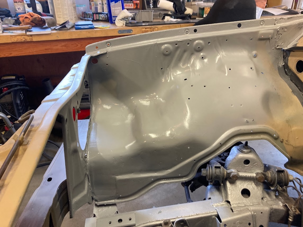 Another shot of the engine bay. A can of spray paint fell and exploded, coating the bay in a layer of primer. This will be fixed.